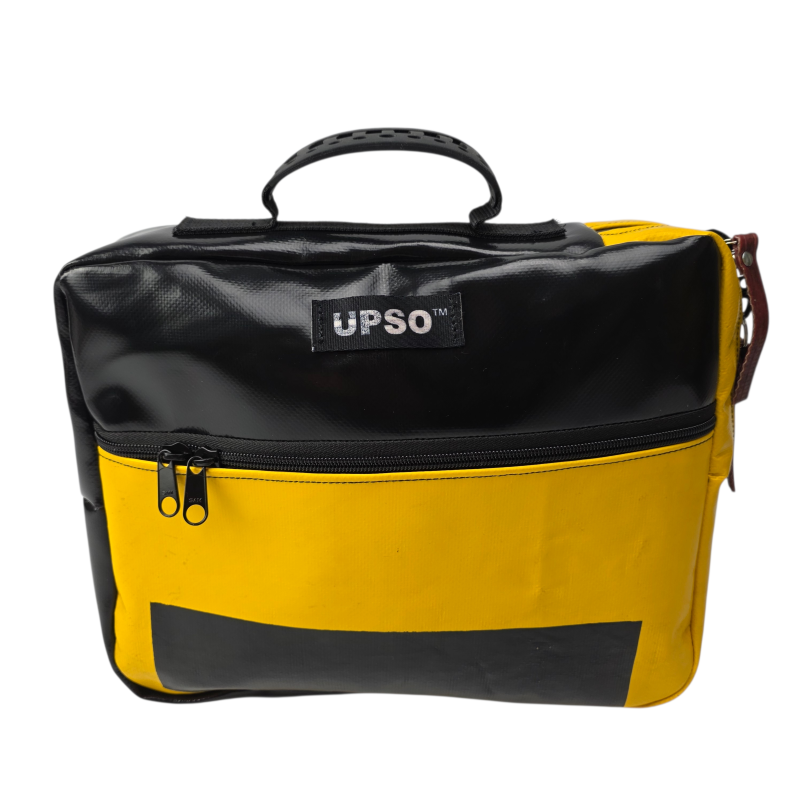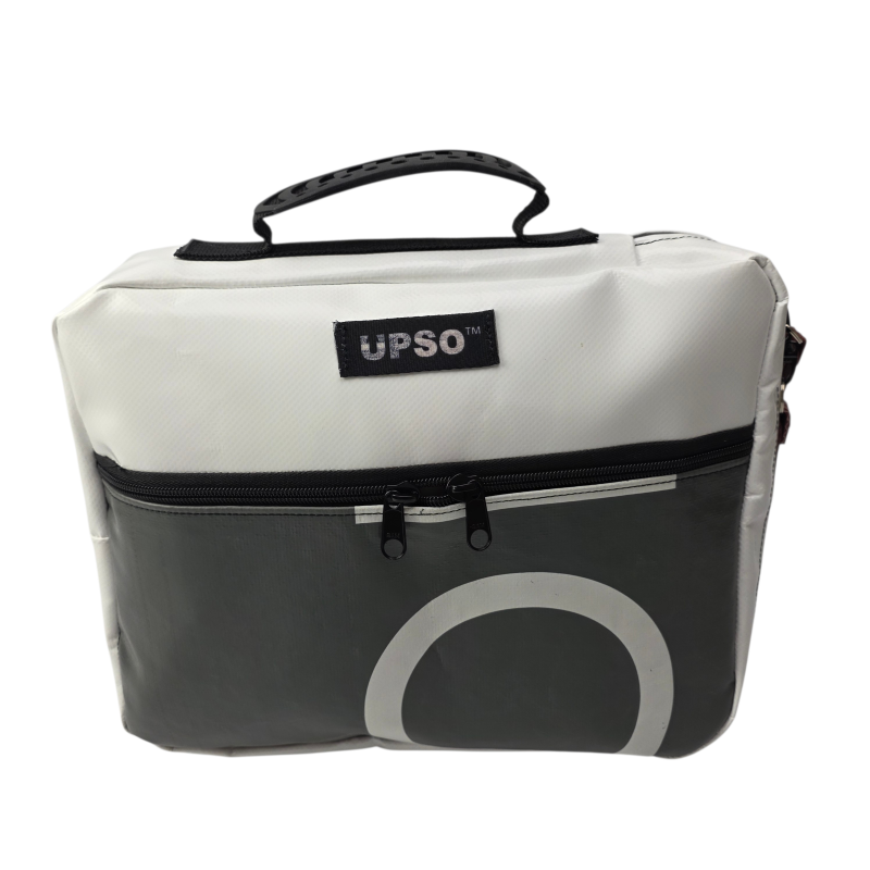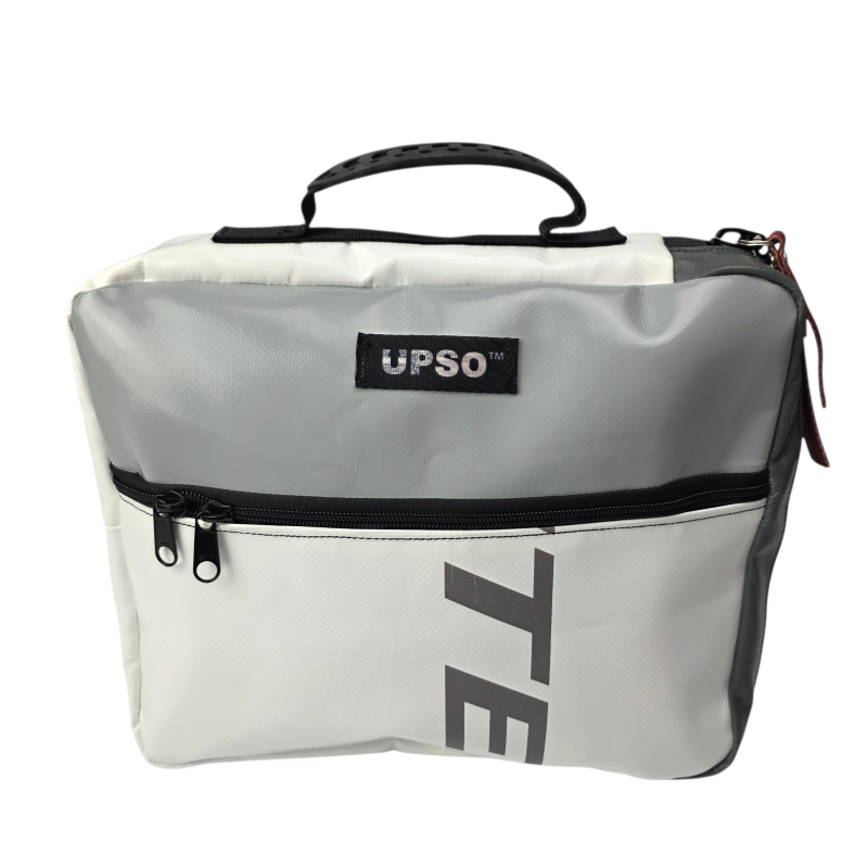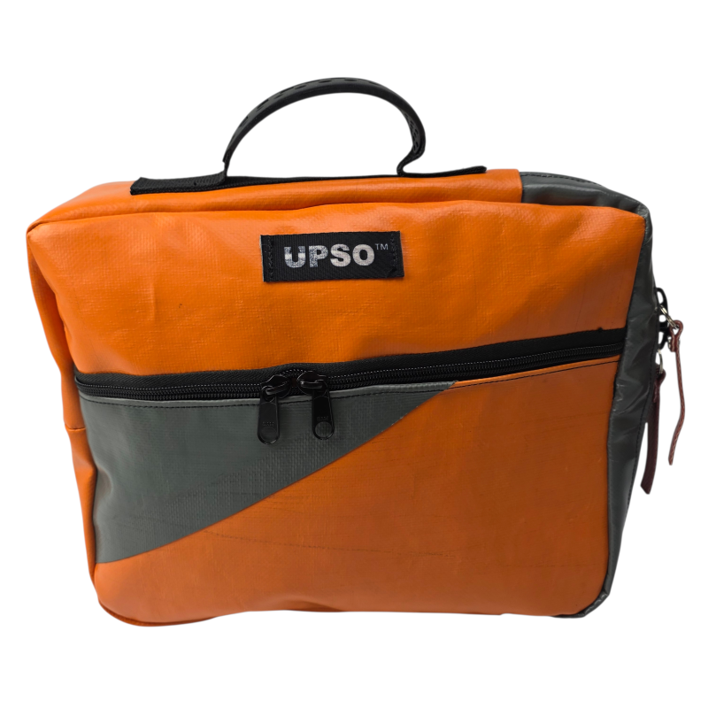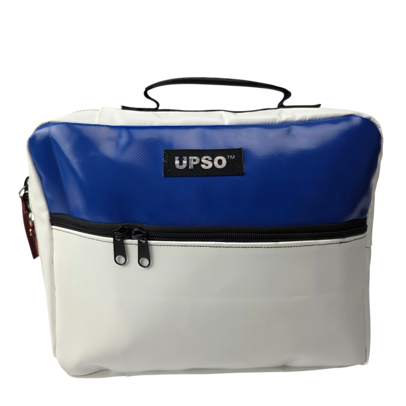 True to UPSO standards, each case is made from upcycled truck tarpaulin, hand-sewn and finished in our Lancashire workshop. Every bag is one of a kind.