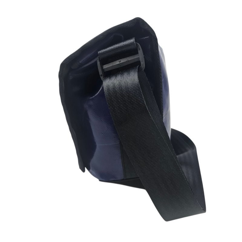 Each bag is individually cut out from recycled truck tarp and made up with recycled fire hose to give the user a totally original bag.